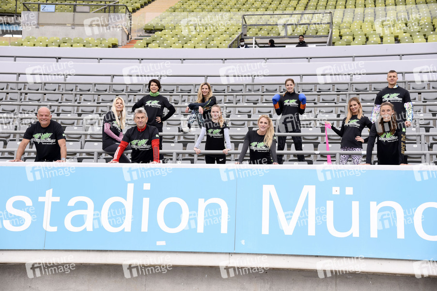 Stefan Lehmann, Tina Kaiser, Janina Hartwig, Klaus Augenthaler, Viola Weiss, Katharina Trost, Anna Kraft, Marie Lang, Karolin Kandler, Christina Hering und Alem Begic beim Fototermin zur sportichen '#WocheChallenge' im Olympiastation München. Unter dem Motto 'Wir können was bewegen!' ruft die Welthungerhilfe zu dieser Challenge auf und bittet um Spenden für eine Welt ohne Hunger. München, 13.10.2020