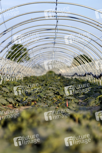 Rhabarber, Rheum rhabarbarum, Plantage, Ackerbau, Landwirtschaft, Gemüse, Folientunnel, Foliendach, Rhabarberplantage, Gewächshaus, Anbau, Acker, Ernte, Rhabarberstangen, Bauernhof, Knöterich, Knöterichgewächse, Bewirtschaftung, Photosynthese, Fotosynthese, Kultivierung, Pflanzung, Pfllanzenaufzucht, Selbstversorger, Standort, Bewässerung, Garten, Nutzgarten, Gartenbau, Symbolbild, Symbolfoto