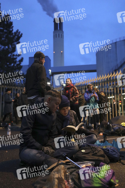 Aktivisten der Umweltschutzgruppe Extinction Rebellion demonstrieren vor dem Vattenfall-Kohlekraftwerk Reuter West. Etwa zehn von ihnen haben sich mit Sekundenkleber am Eingangsgitter festgeklebt. Nach Angaben der Organisatoren handelt es sich um eine schwedische Gruppe XR-Demonstranten. Berlin, 11.10.2019