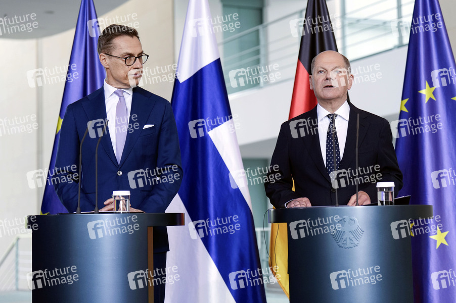 Alexander Stubb und Olaf Scholz beim Empfang des Präsidenten der Republik Finnland zu einem gemeinsamen Gespräch mit anschließendem Pressestatement im Bundeskanzleramt. Berlin, 08.05.2024
