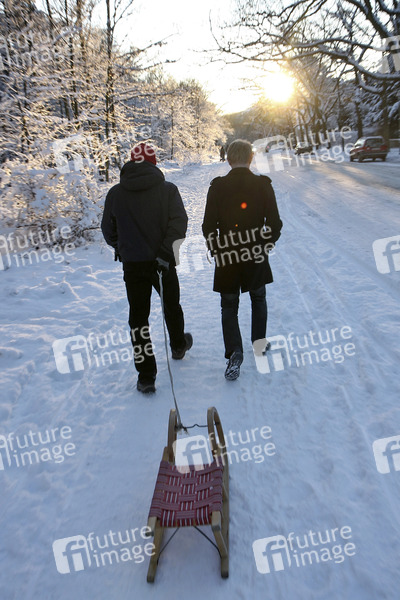 2 Männer mit Schlitten auf dem Weg zum Teufelsberg. Berlin, 05.01.2009
