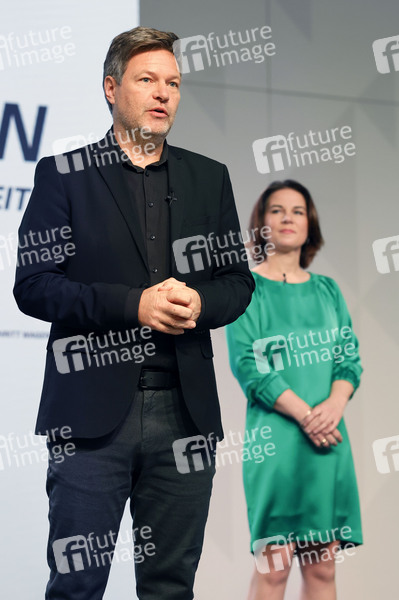 Robert Habeck und Annalena Baerbock beim Pressetermin zur Unterzeichnung des Koalitionsvertrages zwischen SPD, Bündnis 90/Die Grünen und FDP im Futurium. Berlin, 07.12.2021