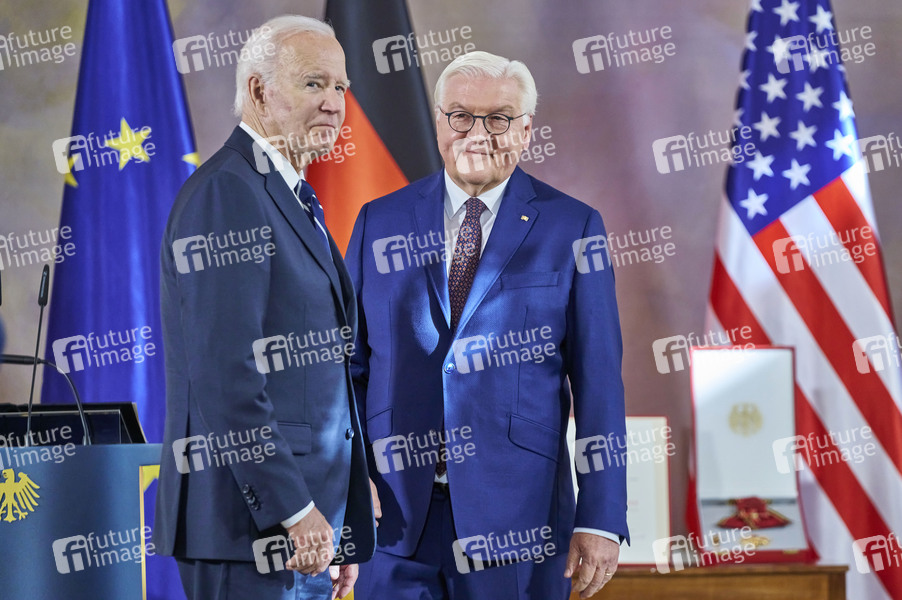 Joe Biden und Frank-Walter Steinmeier bei der Verleihung der Sonderstufe des Großkreuzes des Verdienstordens der Bundesrepublik Deutschland an Präsident Biden für dessen Einsatz für die deutsch-amerikanische Freundschaft und die transatlantische Partnerschaft im Schloss Bellevue. Berlin, 18.10.204