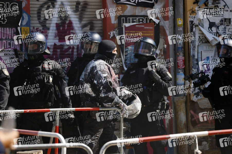 Im teilbesetzten Haus in der Rigaer Straße 94 sollte am Donnerstag der Brandschutz überprüft werden. Nachdem die Bewohner sich zunächst weigerten, die Tür zu öffnen, verschaffte sich die Polizei gewaltsam Zutritt und wurde mit Farbe beworfen. (Quelle: rbb online) Berlin, 17.06.2021