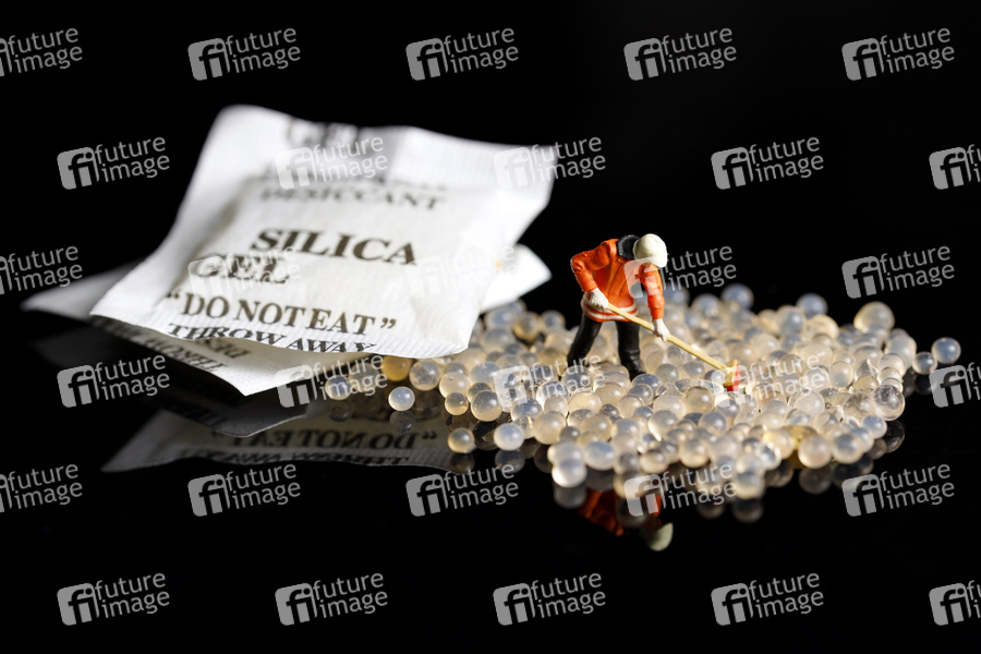 Der Inhalt eines Dry-Pack mit Silica Gel wird von einer Miniaturfigur zusammengekehrt. (Themenbild, Symbolbild)
