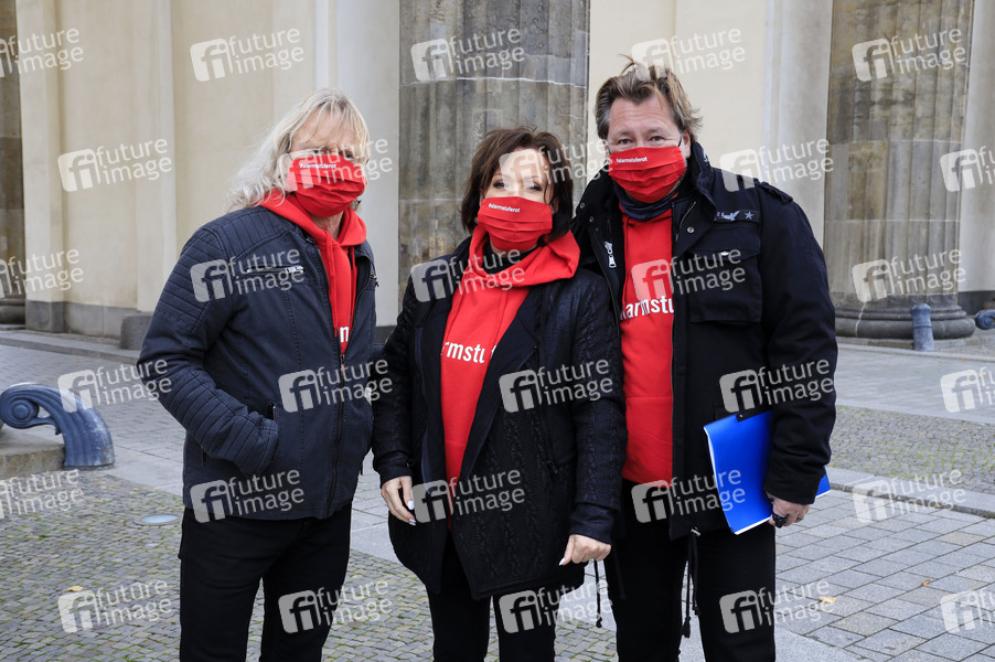Ute Freudenberg mit Christian Liebig und Claudius Dreilich von Karat bei der Demonstration zur Rettung der Veranstaltungswirtschaft vom Aktionsbündnis 'Alarmstufe Rot'. Berlin, 28.10.2020