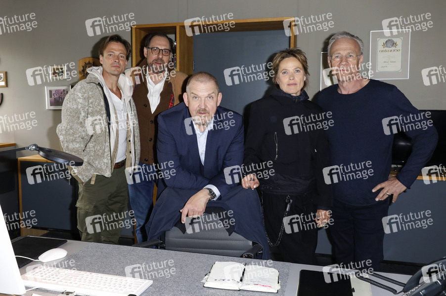 Andreas Pietschmann, Thomas Loibl, Dietmar Bär, Karoline Eichhorn und Klaus J. Behrendt beim Fototermin bei den Dreharbeiten zum ARD-Krimi 'Tatort - Colonius' im Kommissariat-Set in der Max-Planck-Straße. Köln, 26.04.2024