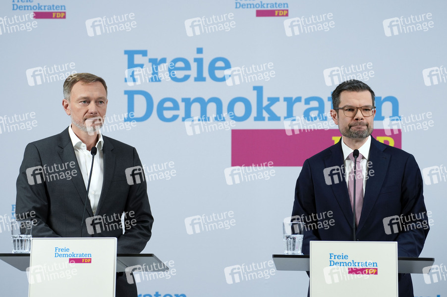 Christian Lindner und Marco Buschmann bei der Presseskonferenz der FDP zur Vorstellung des neuen Generalsekretärs Marco Buschmann im Hans-Dietrich-Genscher-Haus. Berlin, 02.12.2024