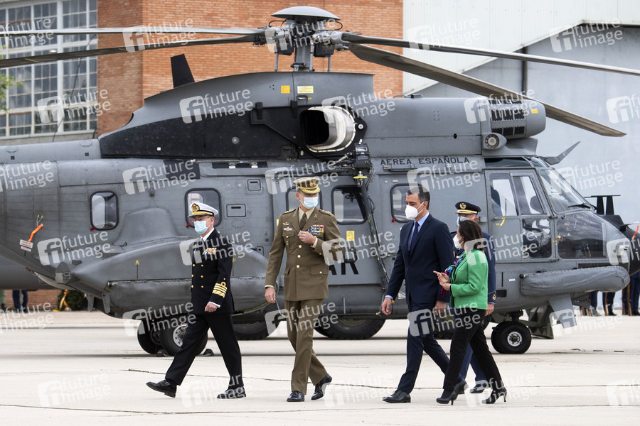 König Felipe VI. von Spanien, Pedro Sanchez und Margarita Robles beim Ehrenempfang auf der Torrejón Air Base für die letzten Soldaten die aus ihrem Einsatz in Afghanistan zurück kommen,. Die Beteiligung Spaniens am Krieg in Afghanistan begann am 27. Dezember 2001. Torrejón de Ardoz, 13.05.2021