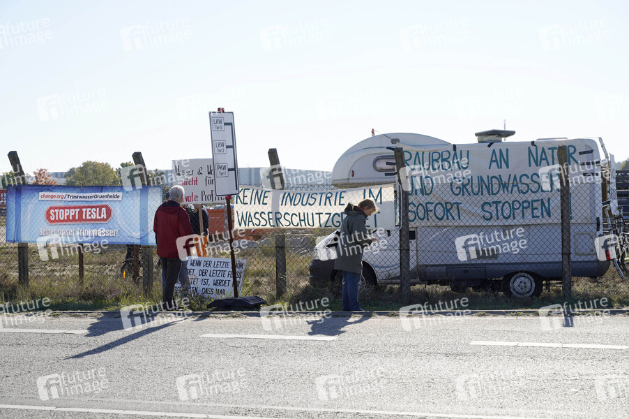 Banner mit Protesten gegen die Gigafactory am Tag der offenen Tür in der Tesla Gigafactory 4. Grünheide, 09.10.2021