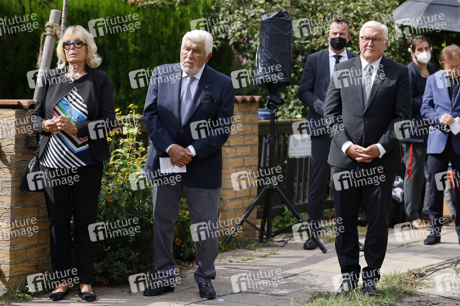 Mario Adorf mit Ehefrau Monique Faye und Frank-Walter Steinmeier bei der Verlegung eines Stolpersteins für NS-Opfer Bruno Lüdke in der Grünen Trift in Köpenick. Berlin, 28.08.2021