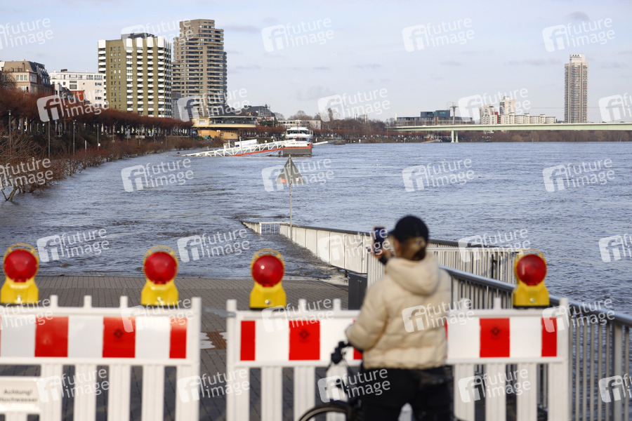 Der Kölner Rheinpegel steigt und steigt. Am Sonntagabend wurde in Köln ein Hochwasser von 7,50 Meter gemessen, der Normalwasserstand liegt sonst bei 3,21 Meter. Die Schifffahrt ist bereits eingeschränkt. Am Kölner Rheinufer werden immer mehr Barrikaden errichtet und Bereiche abgesperrt. Das Wasser klettert auf Promenaden und überspült Treppen und Fähranleger. Köln, 31.01.2021