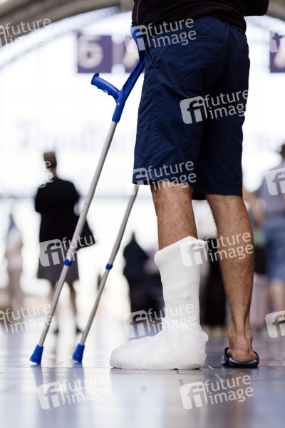 Ein Reisender mit Gipsbein und Krücken am Frankfurter Hauptbahnhof. Frankfurt, 19.08.2020
