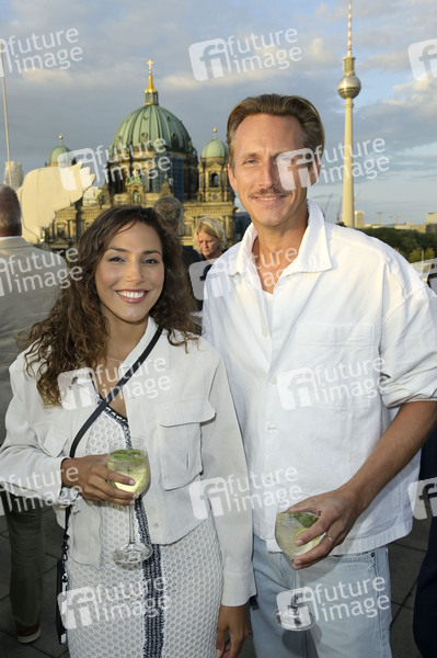 Amy Mußul und Johannes Hendrik Langer beim Eröffnungsempfang der UFA Filmnächte 2024 auf der Dachterrasse der Bertelsmann Repräsentanz. Berlin, 21.08.2024