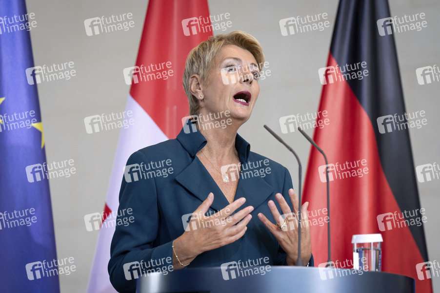 Politik, Bundeskanzleramt, Staatsbesuch, Staatsvisite, bilaterale Gespräche, Treffen, Diplomatie, Kanzleramt, Staatsgast, PK, Pressekonferenz, Pressestatement, Politikerin, Bundespräsidentin der Schweiz