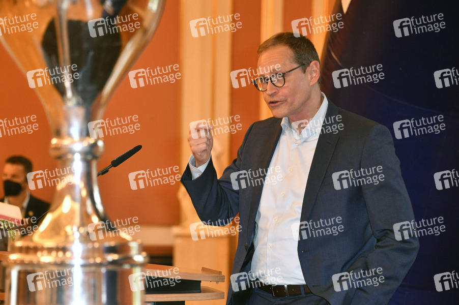 Michael Müller bei Rede und Einzeichnungen der einzelnen Spieler, Trainer und Begleiter der Eisbären Berlin ins Gästebuch von Berlin aus Anlass des 8. Deutschen-Meister-Titels im Roten Rathaus. Berlin, 28.05.2021