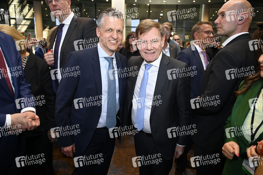 Thorsten Frei und Johann Wadephul bei der Unterzeichnung des Koalitionsvertrages zwischen CDU, CSU und SPD im Gasometer Schöneberg. Berlin, 05.05.2025