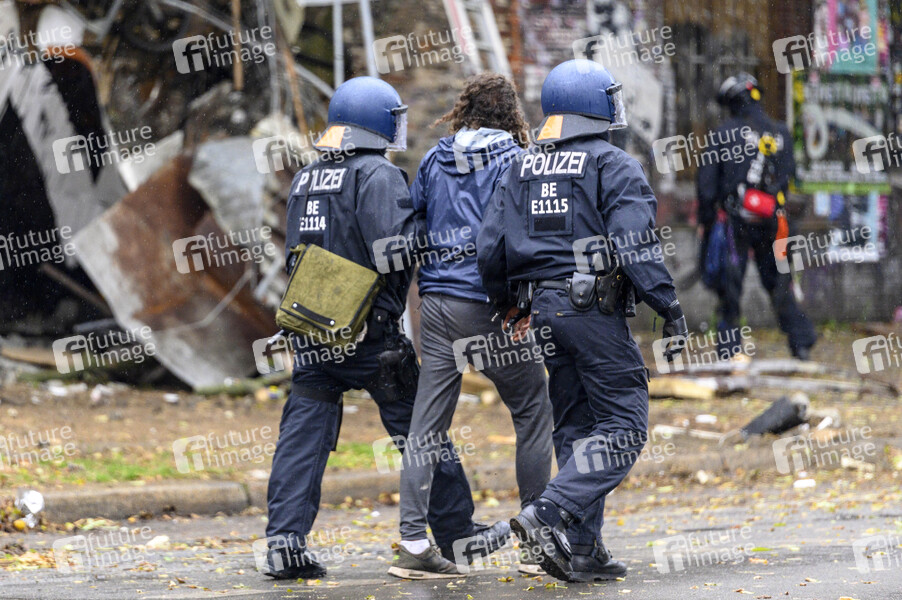 Räumung des linksautonomen Wagenplatzes 'Köpi'. Die Bewohner hatten im Vorfeld angekündigt, sie wollen nicht kampflos aufgeben. Rund eine Stunde haben die Barrikaden des linksautonomen Wagencamps gehalten, dann durchbrach die Polizei den Zaun an mehreren Stellen. Es gab Festnahmen. Berlin, 15.10.2021