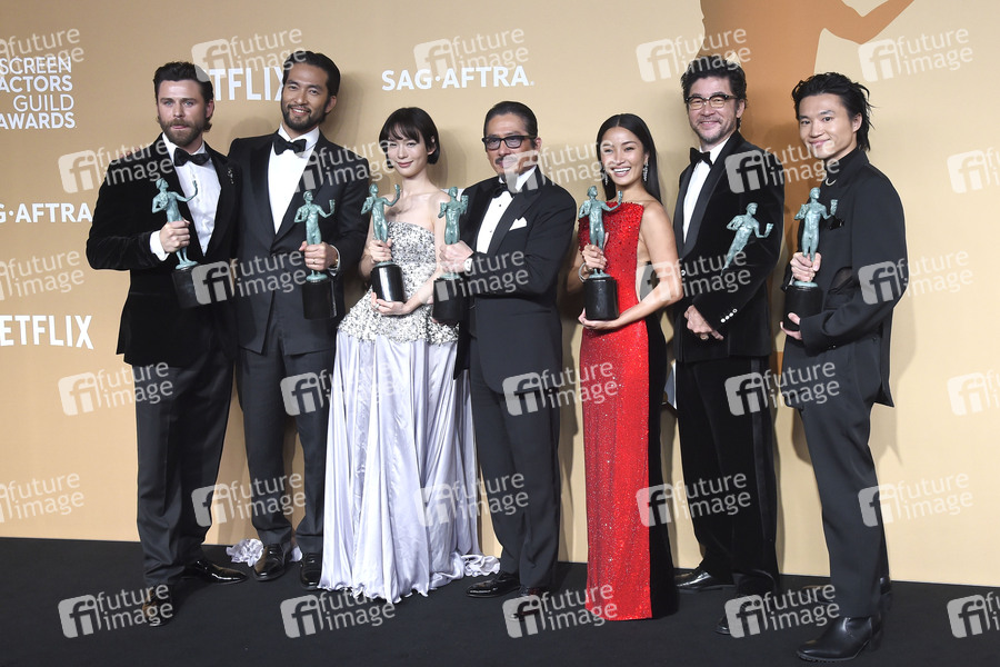 Tommy Bastow, Shinnosuke Abe, Moeka Hoshi, Hiroyuki Sanada, Anna Sawai, Tadanobu Asano und Hiroto Kanai mit den Preisen für das beste Ensemble in der Dramaserie 'Shōgun' beim Preisträger-Photocall der 31. Screen Actors Guild Awards 2025 im Shrine Auditorium and Expo Hall. Los Angeles, 23.02.2025