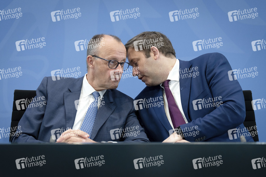 Friedrich Merz und Lars Klingbeil beim Pressestatement zu den Ergebnissen der Beratungen vom Koalitionsausschuss im Bundeskanzleramt. Berlin, 28.11.2025