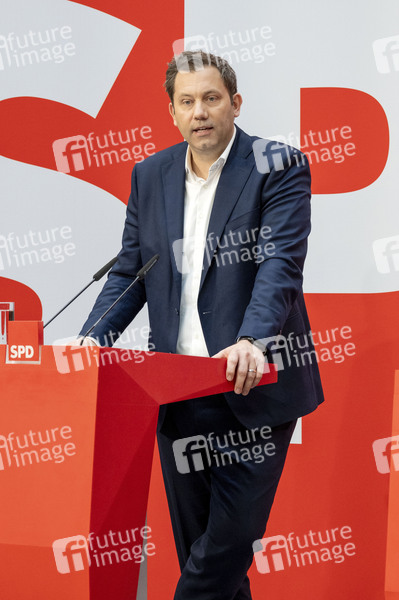 Lars Klingbeil bei einer Pressekonferenz der SPD zu den Bundestagswahlen im Atrium des Willy-Brandt-Hauses. Berlin,24.02.2025