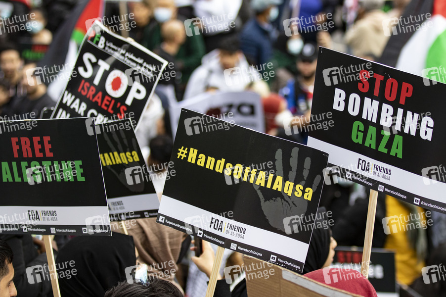 Tausende Menschen bei einem Protestmarsch, organisiert von pro-palästinensischen Organisationen. Viele Teilnehmer trugen Palästina-Fahnen und 'Free Palestine'-Banner. Ein Sprecher der Gruppe forderte die britische Regierung auf, ihre militärische, diplomatische und finanzielle Unterstützung für Israel umgehend einzustellen. London, 21.03.2021