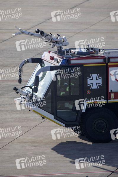 Einsatzfahrzeug der Bundeswehr-Feuerwehr Köln bei der Notfallübung der Werkfeuerwehr, der Feuerwehr Köln und den Hilfsorganisationen am Flughafen Köln/Bonn. Im Rahmen der Übung wird die Kollision eines Flugzeugs mit einem Passagierbus und einer Abfertigungshalle simuliert. Einsatzkräfte retten aus dem in Brand geratenen Flugzeug und dem Gebäude Personen und versorgten diese. Köln, 06.11.2021
