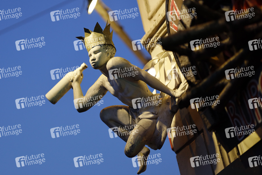 Ein junger Bacchus als Figur an einem Restaurant in Köln-Ehrenfeld. Bacchus ist ursprünglich die lateinische Form von Bakchos, einem Beinamen des Dionysos, Gott des Weines, des Rausches. Besonders die Gastronomiebranche leidet wirtschaftlich unter den Coronamaßnahmen. Einzelne Lokale wenden daher vorauseilend die 2G-Regel an, die nur noch Geimpften und Genesenen Zutritt zu den Lokalitäten erlaubt. (Themenbild, Symbolbild) Köln, 12.09.2021