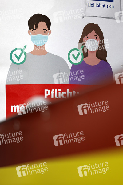 Einkaufen, Supermarkt, Supermärkte, Shopping, LIDL, LIDL-Markt, Coronaschutzverordnung, Maskenpflicht, Masken, Maske tragen, Mund-Nasen-Bedeckung, Mund-Nasen-Schutz, MNS, FFP2, medizinische Masken, Stoffmasken, Behelfsmasken, Corona, Virus, Coronavirus, Coronaviren, Schild, Hinweis, Hinweisschild, Corona-Maßnahmen, Corona-Politik, Coronamaßnahmen, Corona-Regeln, Coronaregeln, dritte Welle, zweite Welle, Kontaktbeschränkungen, Inzidenz, Inzidenzwert, Inzidenzwerte, Gesundheit, Hygiene, Neuinfektionen, R-Wert, Inzidenzzahl, Maskenzwang, Infektionsschutzgesetz, Infektionsschutz, 7-Tage-Inzidenz, Gesundheitspolitik, Zeitgeschichte, Corona-Auflagen, Lockdown, Lock Down, Solidarität, Symbolbild, Symbolfoto