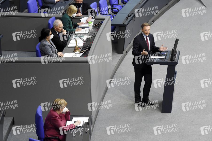 Angela Merkel und Christian Lindner in der 222. Sitzung des Deutschen Bundestages im Reichstagsgebäude. Berlin, 16.04.2021