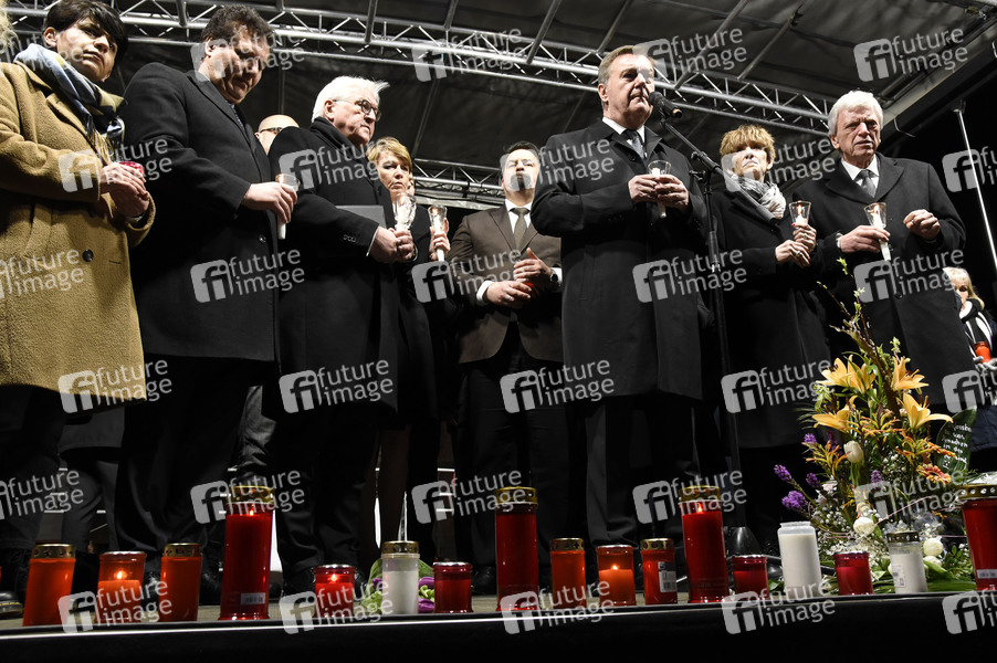 Frank-Walter Steinmeier, Elke Büdenbender, Aiman Mazyek, Claus Kaminsky, Ursula Bouffier und Volker Bouffier bei einer Mahnwache für die Opfer des rechtsextremen Anschlags auf dem Marktplatz. Hanau, 20.02.2020