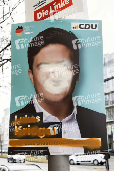 Übersprühtes Wahlplakat zur Bundestagswahl mit Motiv Lukas Krieger CDU. Berlin, 14.01.2025