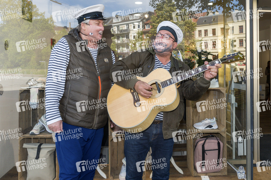 Klaus Baumgart und Claas Vogt von Klaus & Klaus beim Fototermin vor der Textildruckerei EINDRUCK, welche Mund-Nase-Masken mit dem echten Lächeln der Träger herstellt. Hamburg, 06.05.2020