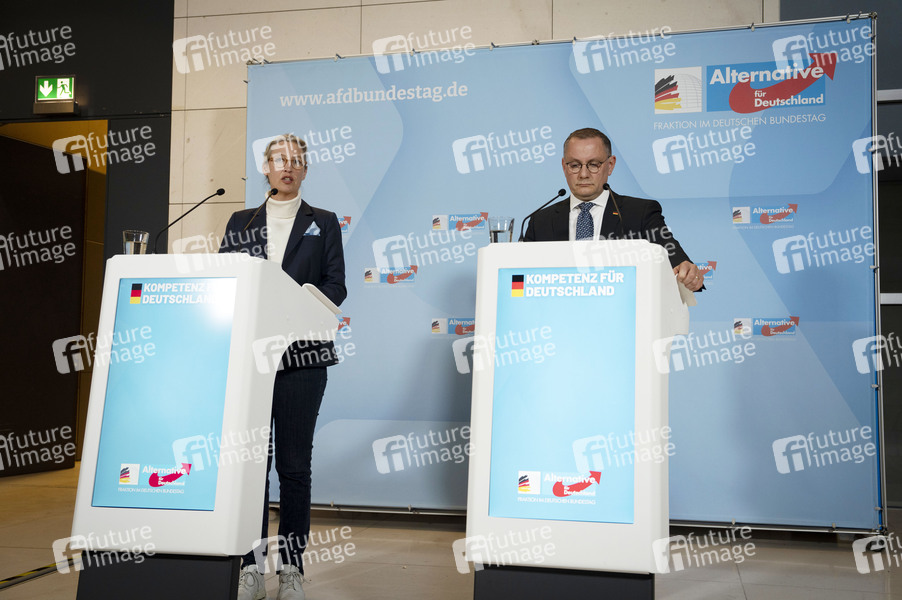 Alice Weidel und Tino Chrupalla beim Pressestatement zur Fraktionssitzung der AfD-Bundestagsfraktion im Reichstagsgebäude. Berlin, 12.03.2025