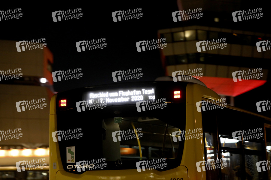 Flughafenbus vor Tower - Der Flugbetrieb am Flughafen Berlin-Tegel 'Otto Lilienthal' wird am 08.10 2020 eingestellt. Berlin, 07.11.2020