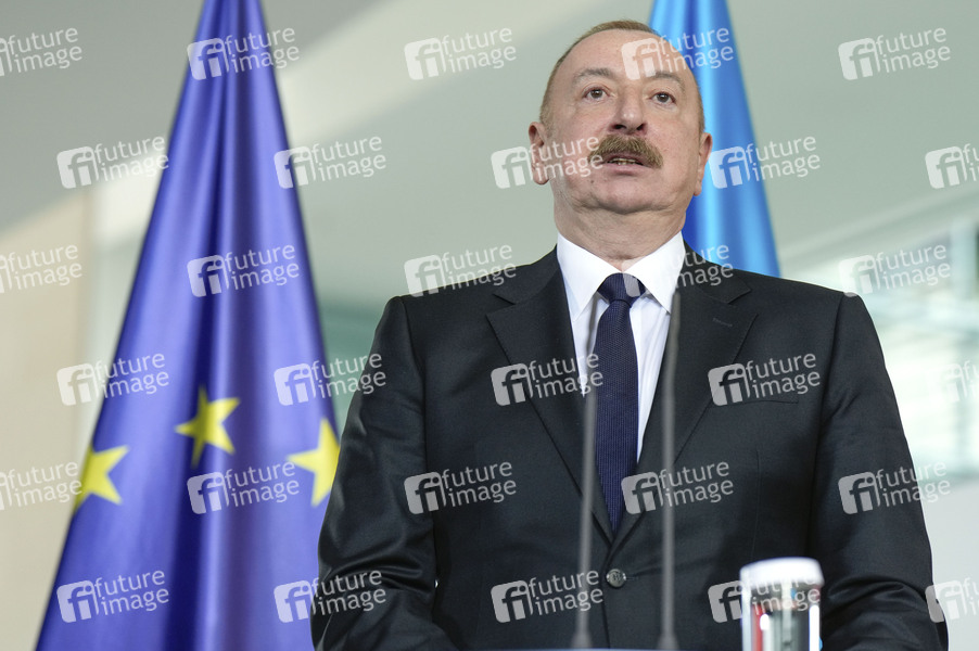 Ilham Alijew beim Empfang des Präsidenten von Aserbaidschan zu einem Gespräch mit dem Bundeskanzler mit anschließendem Pressestatement im Bundeskanzleramt. Berlin, 26.04.2024