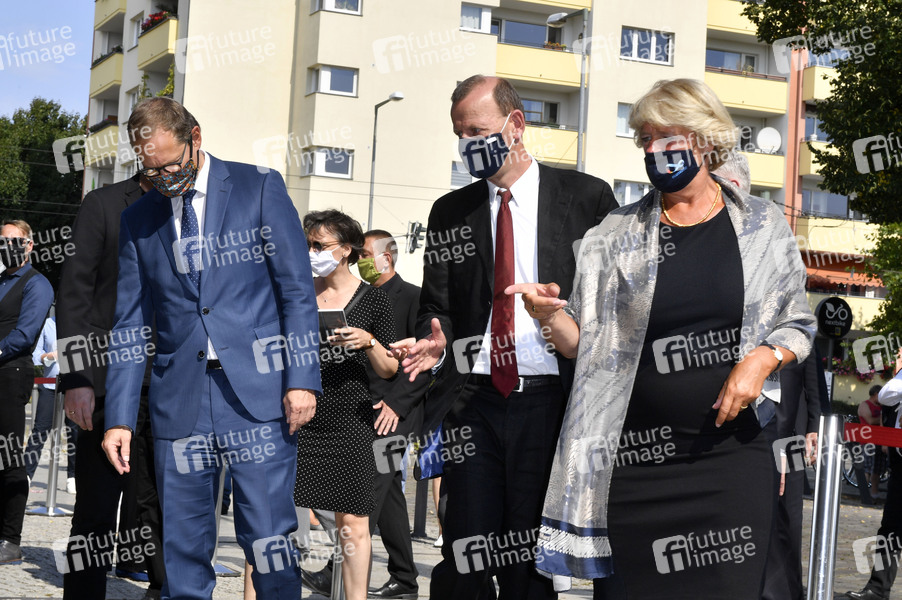 Michael Müller, Axel Klausmeier und Monika Grütters bei der Gedenkveranstaltung und Kranzniederlegung zum Jahrestag des Baus der Berliner Mauer in der Kapelle und am Denkmal der Gedenkstätte Berliner Mauer. Berlin, 13.08.2020