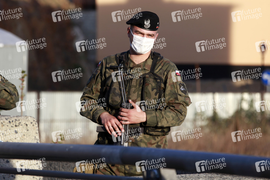 Grenzverkehr, Grenze, EU, Epidemie, Pandemie, Corona, Virus, Infektion, Lungenkrankheit, Schutzmaske, Mundschutz, Schutzanzug, Polen, SARS-CoV-2, Covid-19, Schutzmaßnahmen, Grenzübergang, Corona-Angst, Ansteckungsangst, Seuche, Corona-Test, Corona-Tests, Coronatest, Coronatests, anstecken, Corona-Krise, Vorbeugung, Prävention, schützen, Schutz, Atemschutz, Atemschutzmaske, Virenschutz, Schutzmaske, Schutzmasken, Atemschutzmasken, Maske, Masken, Mundschutz, Mund-Schutz, Mund-Nase-Schutz, Mund-Nasen-Schutz, MNS, Waffe, Machinenpistole, Militär, Waffen