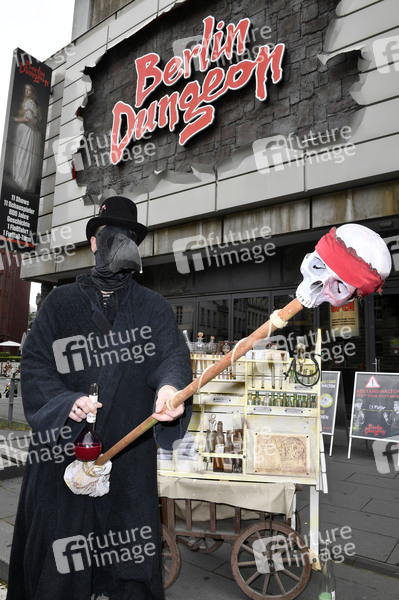 Der Pestarzt mit Stinkestab und dem Allheilmittel Theriak bei der Wiedereröffnung des Berlin Dungeon. Berlin, 09.07.2020