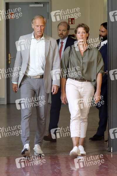 Gerhard Delling und Christina Block in einer Pause im Prozess wegen mutmaßlicher Kindesentführung gegen Christina Block am Landgericht Hamburg. Hamburg, 19.08.2025