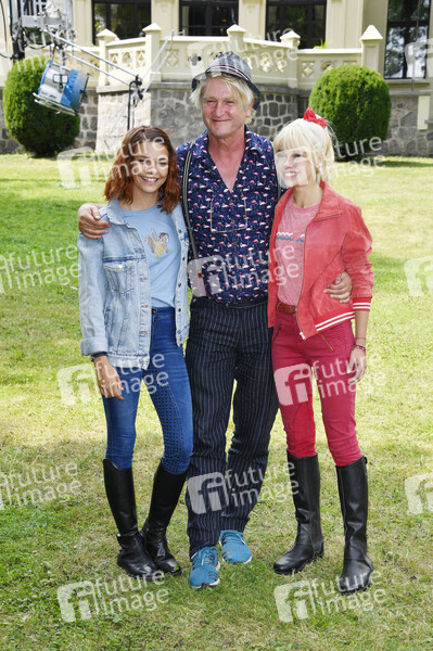 Harriet Herbig-Matten, Detlev Buck und Katharina Hirschberg beim Fototermin am Set der Amazon Original Serie 'Bibi & Tina' auf Schloss Reichenow. Reichenow-Möglin, 06.08.2019