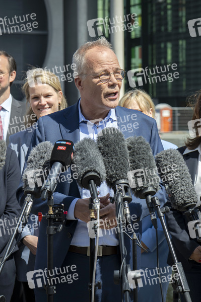 Matthias Miersch beim Pressestatement zur Wahl zum Vorsitzenden der SPD-Fraktion vor dem Reichstagsgebäude. Berlin, 07.05.2025