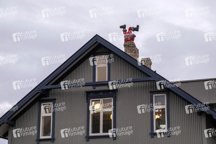 Die Figur eines Weihnachtsmanns steckt kopfüber in einem Kamin eines Wohnhauses fest. Reykjavik, 14.12.2020