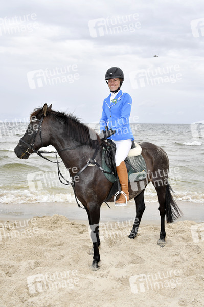 Rhea Harder-Vennewald beim Defilée der Reiter und Hunde von Heringsdorf entlang des Strandes zur Seebrücke Ahlbeck. Usedom, 08.09.2019