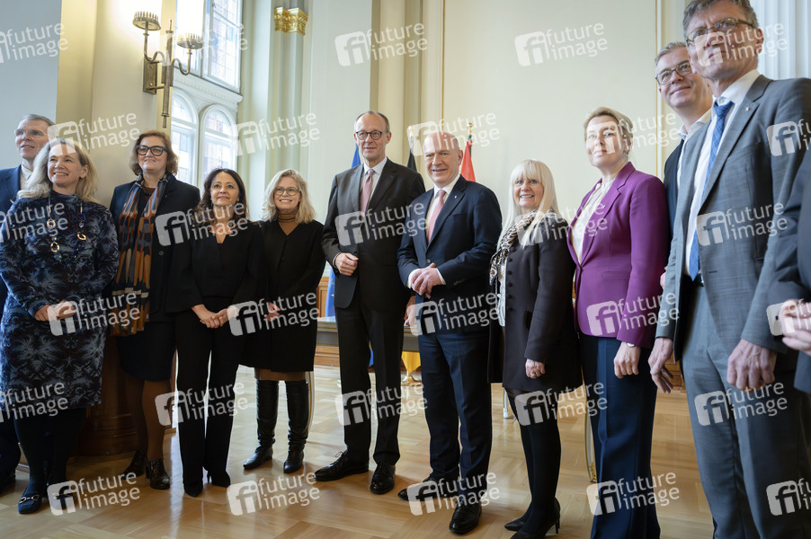 Friedrich Merz und Kai Wegner mit Mitgliedern des Berliner Senats beim Antrittsbesuch des Bundeskanzlers im Roten Rathaus. Berlin, 03.12.2025