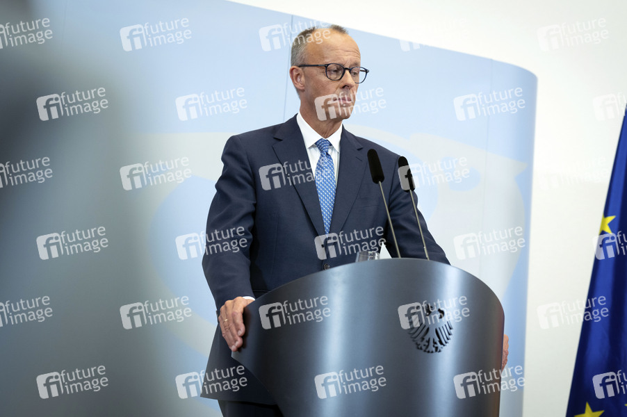 Friedrich Merz beim Pressestatement zu Kabinettsthemen nach der 14. Sitzung des Bundeskabinetts im Bundesministerium der Verteidigung. Berlin, 27.08.2025