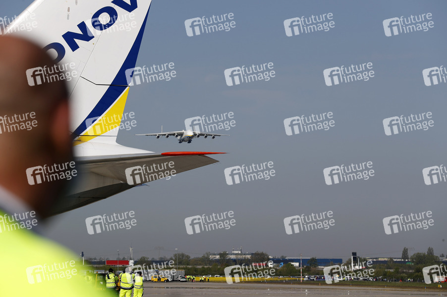 Ankunft einer Antonow 225 mit einer Lieferung von Schutzmaterial aus China auf dem Flughafen Leipzig/Halle. Mehr als zehn Millionen Schutzmasken kommen als Bundeswehr-Transport mit einer Antonow 225, dem größten und schwersten Frachtflieger der Welt, aus dem chinesischen Tianjin. Das Bundesministerium der Gesundheit hatte sich Anfang April mit der Bitte um Unterstützung beim Transport von Schutzausstattungen an das Bundesministerium der Verteidigung gewandt. Leipzig, 27.04.2020