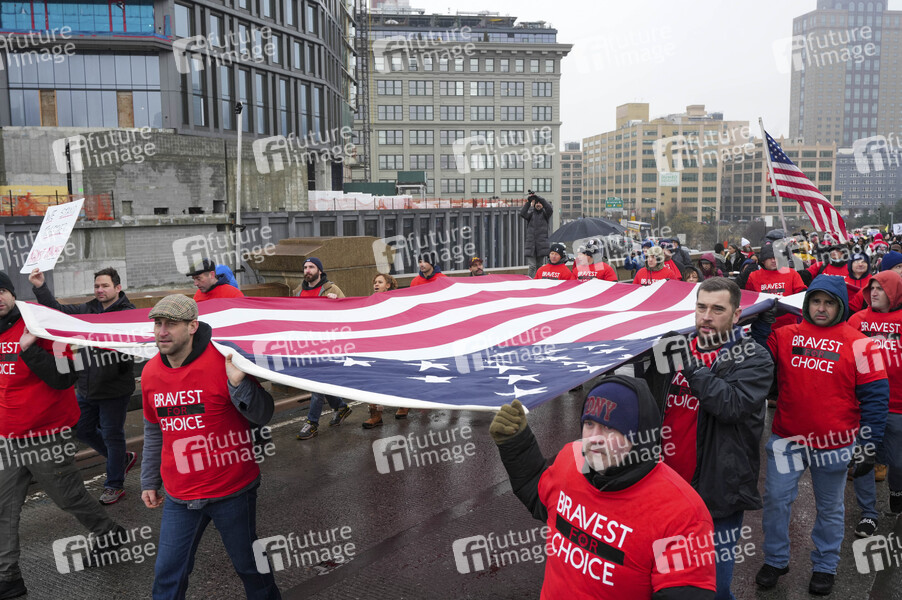 Über 300 Stadtarbeiter und andere protestieren mit einem Marsch über die Brooklyn Bridge, gegen die Ankündigung der Stadt, dass kommunale Angestellte ohne Covid-19-Impfung bis zum Ende der Woche entlassen würden. New York, 07.02.2022