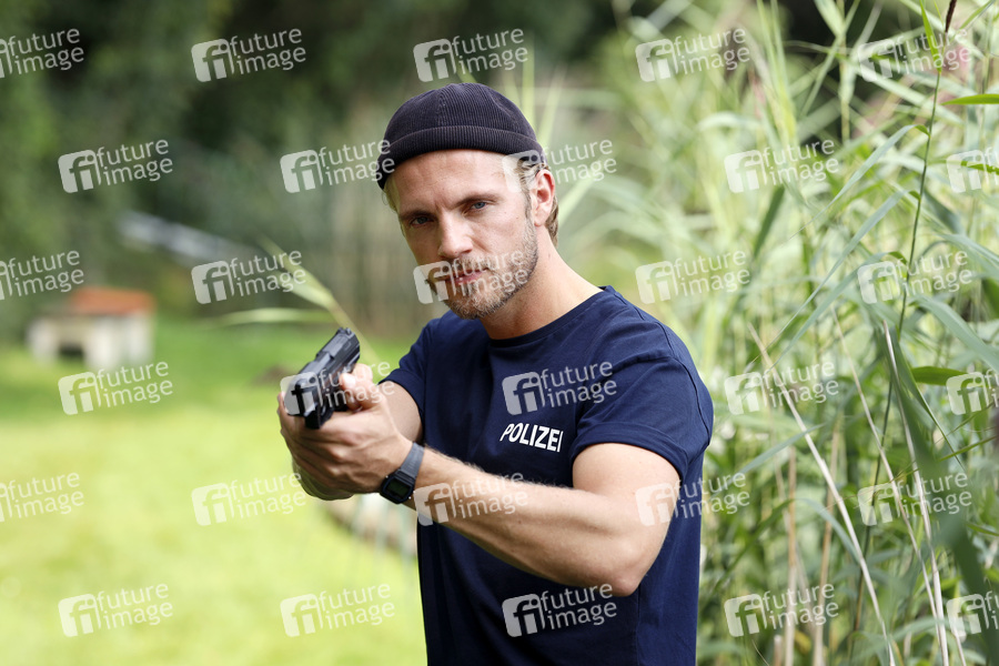 Frank van Dijk in 'WaPo Duisburg', Paul Wiedmann in 'Gute Zeiten, schlechte Zeiten ', Robin Mertens in 'Rote Rosen', Prominenz, Celebrity, Celebrities, Dreharbeiten, Filmset, Location, Settermin, Unterhaltung, Entertainment, Photocall, Fotocall, Wasserschutzpolizei, TV, Fernsehen, TV-Serie, Fernsehserie, Krimi-Serie, Waffe, Pistole, Schauspieler