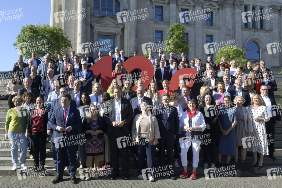 Hubertus Heil, Lars Klingbeil und Rolf Mützenich mit Gewerkschaftern und SPD-Mitgliedern bei einer Kundgebung zur Befürwortung des 12-Euro-Mindestlohns vor dem Reichstagsgebäude. Heute wird im Bundestag über den 12-Euro-Mindestlohn ab Oktober 2022 abgestimmt. Berlin, 03.06.2022